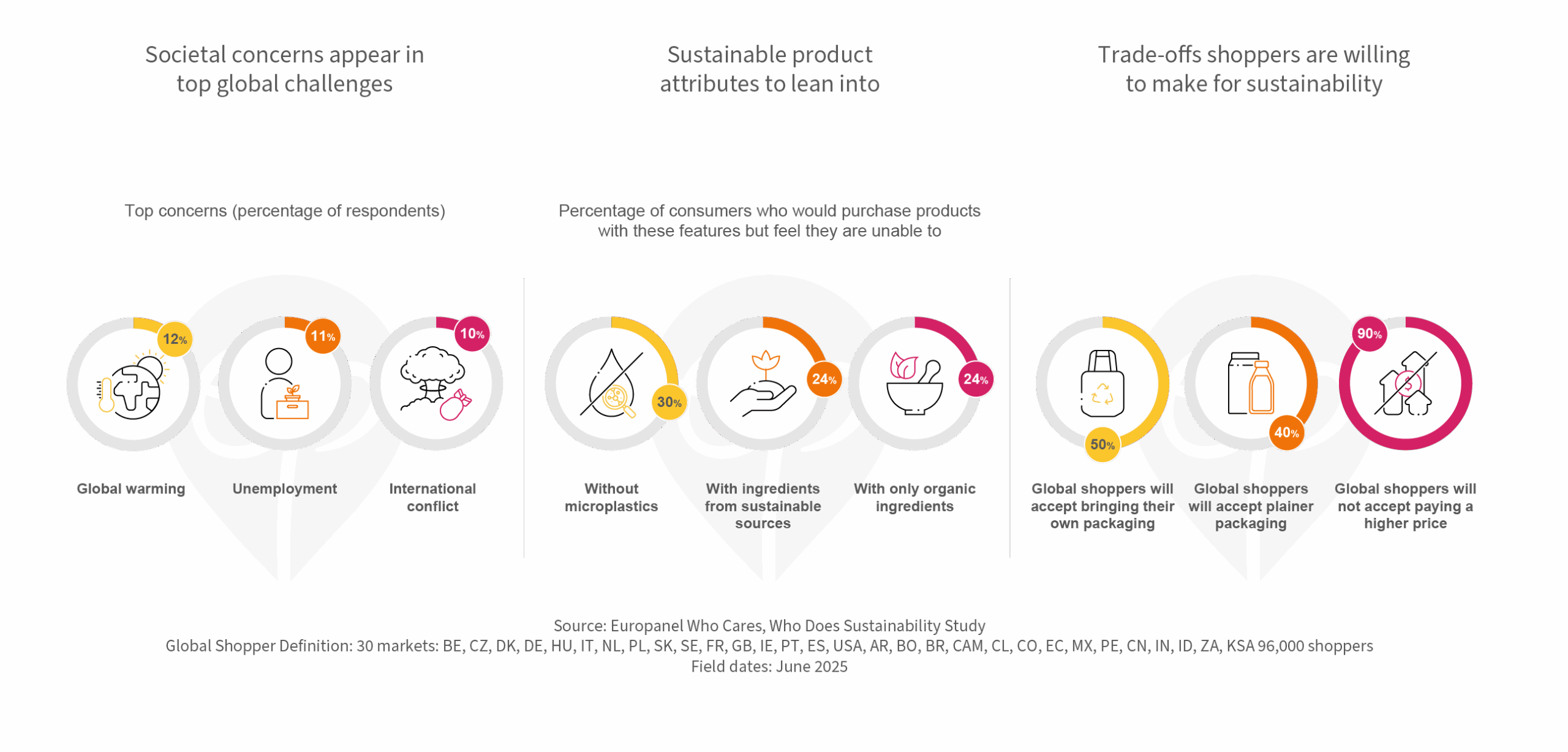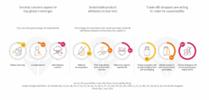 Global warming was the top environmental challenge listed, with water shortage and water pollution not far behind. The societal challenges that appear top of mind for shoppers are unemployment and international conflict.