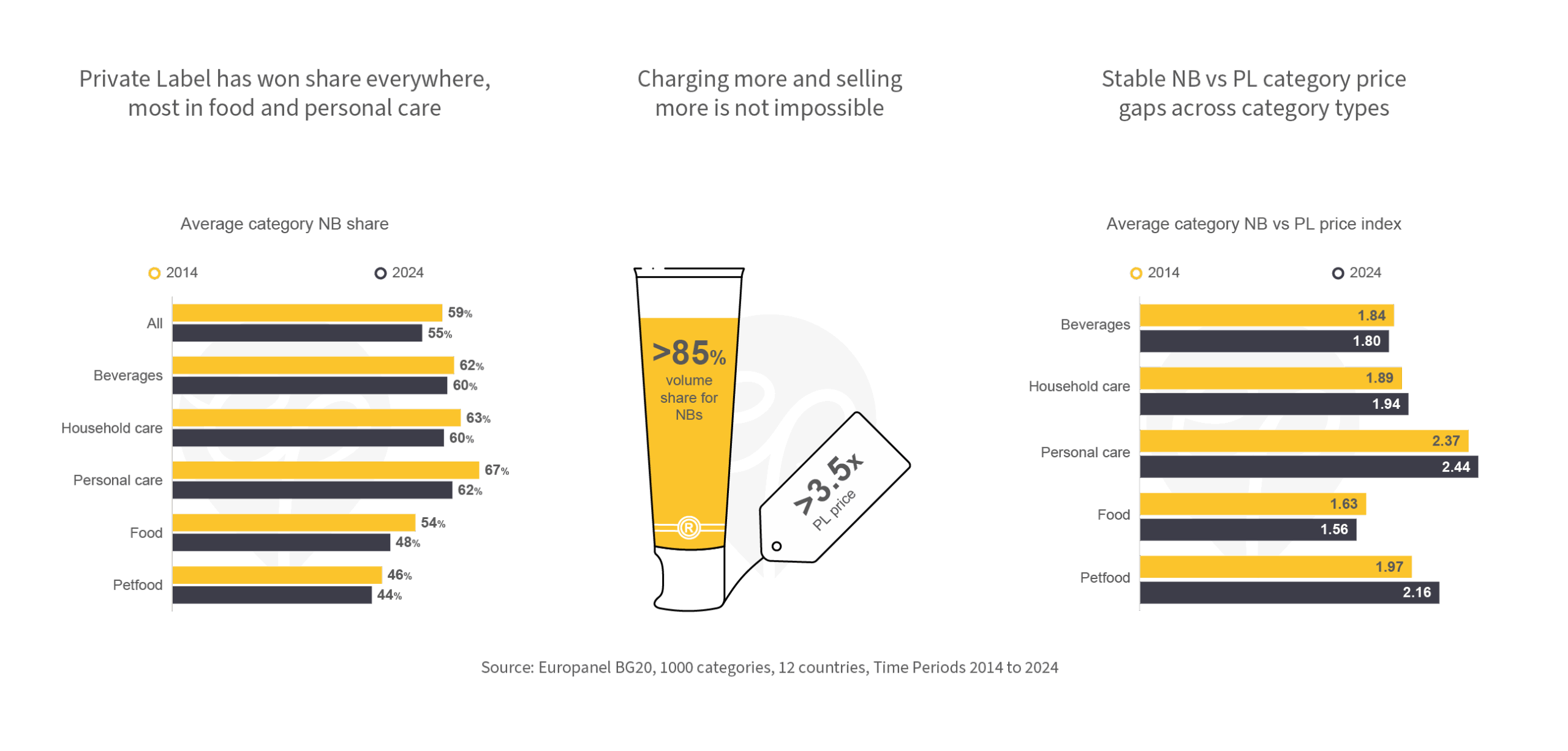 Average NB price premia over PL remain remarkably stable across categories. In personal care, national brands continue to command the highest relative prices, charging around 160% more than PLs in both 2014 and 2024. In food, by contrast, the average premium is much lower at about 60%. Petfood stands out as the only segment with a clear increase, with NB premia rising from roughly 100% to 120%. In summary, even though NB shares have slipped, relative prices have remained broadly stable on average.