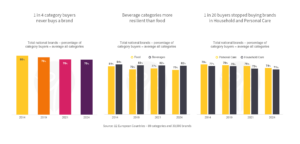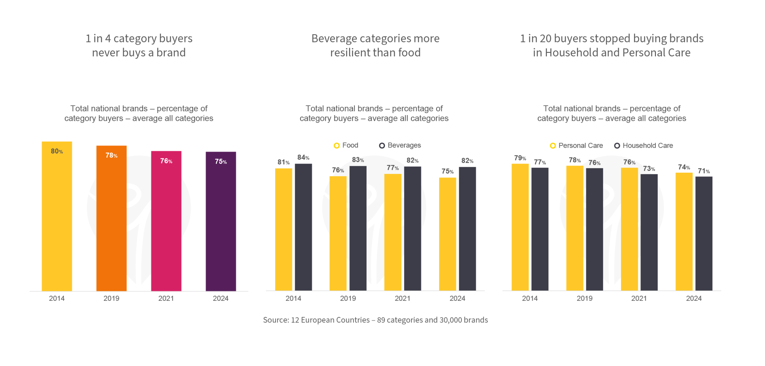 Over the last 10 years in Europe, national brands have lost 1 in 20 buyers to Private Label (i.e., they stopped buying brands) and in 2024 only 3 out of 4 buyers in the average category are choosing a national brand at least once a year. Bearing in mind the importance of penetration for sales and share, this is critical.